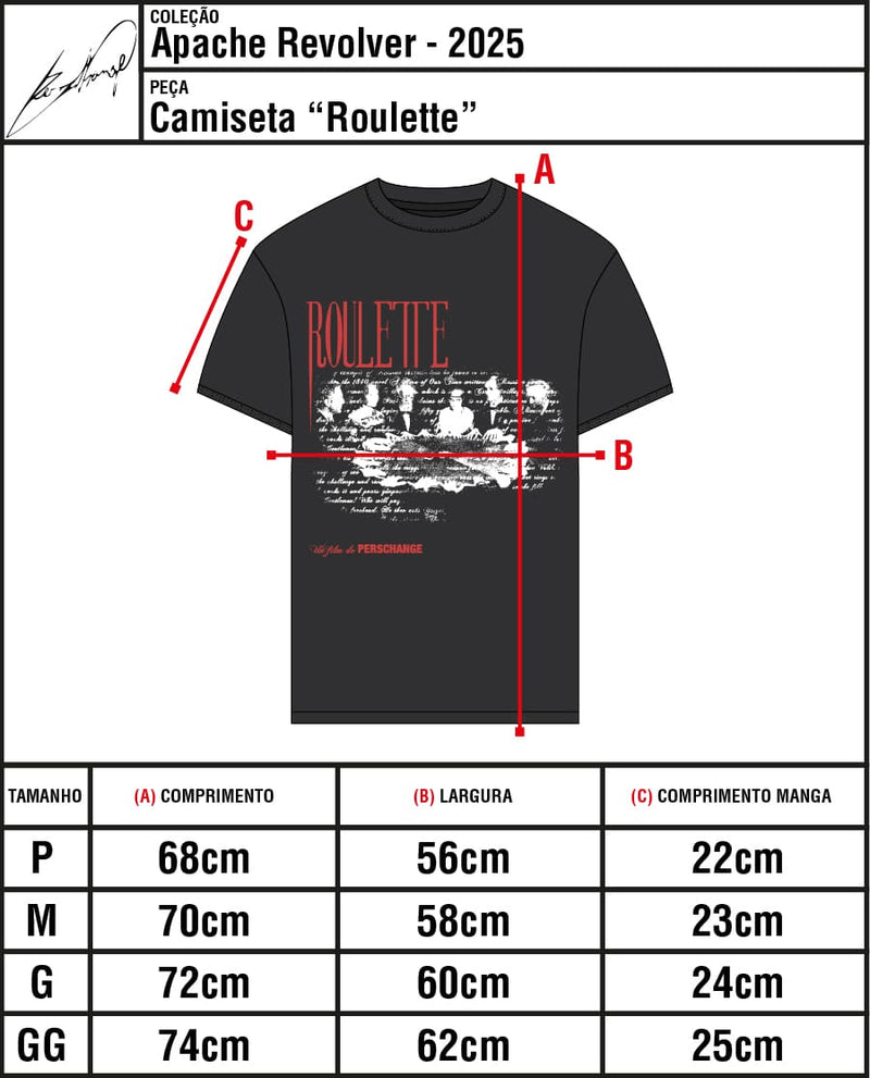 A Roulette T-shirt é confeccionada em malha 100% algodão de 240 GMS pré-encolhida.